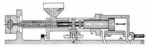 The injection plunger presses have the same design as the press shown in image 5.6. Plastic matter (flakes or granules) are introduced at the top of the injection pot using gravity. This can have an injection capacity that reaches 60 to 70 grams. The piston is moved either manually (via a lever or crank) or via a hydraulic system. A system of heated resistors turned around the injection pot provides the heating. It is covered with an insulating sheath.