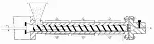 The most simple screw has a constant flow but a variable groove depth: the inside diameter of the screw increases from the top (mouth) to the outlet in order to compensate the compaction. The "compression ratio" (input-output volume ratio) is often between 3 and 4. There are also screws with a double helix (variable pitch). Others have a posterior zone containing chicanes or torpilles that break the pudding contained in the screw and thus improve the mixing. Some screws are made of two homogenizing areas separated by a "recreation area" which allow to release any potential gas. Finally, the recent extruders can have double screws of which the flows mesh together parallelly and revolve in the same direction or inversely. This system noticably improves the mixing/homogenization function. The behavior of the plastic in the extruder can be divided into three zones: