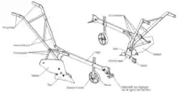 Many models of ploughs use, instead of the system presented here to alter the settings, a system of rod-traction. In practice it is difficult to work with, and it is more difficult to manufacture. Initially, at Camp Perrin the horizontal part of the plough-beam was made of wood. The strength of the wood was sufficient and flexibility gave the whole an elasticity, which by absorbing the shocks, offered some comfort to both the farmer as well as the animal. However, models with a plough-beam of wood sold much less well because they looked more "ancient".