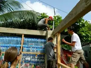 - A rural public pharmacy (Las Malvinas) made from plastic bottles (Las Malvinas botica popular ecoladrillo 2013) and blocks made of rice husks, rice husk ash, lime, cement, and sand (Las Malvinas botica popular hullkrete 2013).