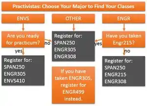 - 8 Units: 2 Units of Spanish and six units (two of the following courses), depending on your track - ENGR 308 Technology and the Environment (Upper Division Area B GE), ENVS 410 Environmental Science practicum, ENGR 305 (Upper Division Area B GE), ENGR 215 Introduction to Design