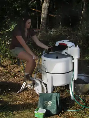 This blender was designed and built as a 1997 HSU whole earth engineering 114 project by Saramie Williams and project guide, Bart Orlando. It was featured on the front page of the San Francisco Chronicle back in March of 2001. In 2003 the first improvements in the drive line and general refurbishments were completed as another engineering 114 class project which Bart guided to completion. Further design progress was put on hold while CCAT itself was dismantled, moved and refurbished. In 2008 CCAT co-directors granted Bart's request to restore the blender after it became weathered and rusted from being stored outside for more than a year. New bearing assemblies were purchased to replace those that had rusted and the blender was disassembled for refurbishment. However the project was put on hold again for another 6 years, over which time the dissembled drive line parts went missing. CCAT has granted Bart's request that this bit of history be restored to its original condition and shall fund the replacement of those missing parts, (as well as the refurbishment/rebuilding of the weathered counter-top assemblage.)