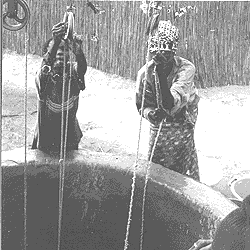This woman has just hooked her pulley to the support over the well. Now she works on laying the rope over the pulley wheel. There is no guide to keep the rope into the groove, so the rope can fall off when the pulley is carried around. But in actual use this is not a problem, as the groove is deep enough and the sides of the groove are smooth. Pulleys can be bought at the local market in different sizes, the other woman uses a pulley with a smaller diameter wheel.