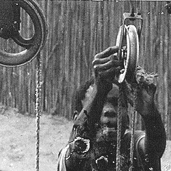 The use of a pulley to lift water from a well is a great improvement over having to lift a bucket with water on a rope with your arms stretched out in front of you. In Gambia there were farms and gardens abandoned because the water table had sunken too deep. To lift water from these wells in sufficient quantity to water the garden had become too heavy a task. As the pulley cannot always be left at the site of the well to prevent theft, such a pulley should be light in weight as to make it easy to take it home. It should be robust, take rough handling such as smashing it against a wall or the floor. It should run accurate with little friction. As indispensable for productive working, it should be easy to repair, even during use in the field.