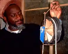 The first prototype developed by Demotech, shown here by Ives Faye. Ives and Reinder took this prototype to Senegal in February 2003. It inspired at the intended test location in Keur Mousse a similar pulley with a larger diameter.
