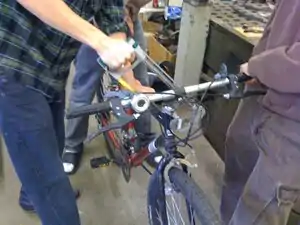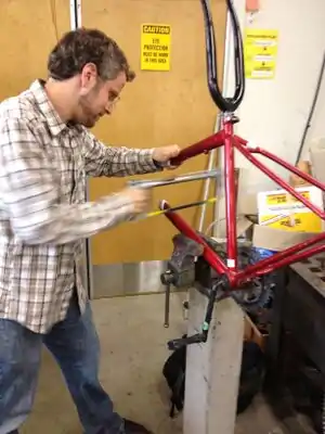 Donated bicycle. (Photo by Luke Halonen) - Disassemble one bicycle down to the frame by removing the brakes, shifters, derailleurs, handlebars, front forks, and wheels. Leave at least one pedal on, noted in the next step. Separate the front and rear wheels from their hubs by cutting and removing their spokes. These will be used later.