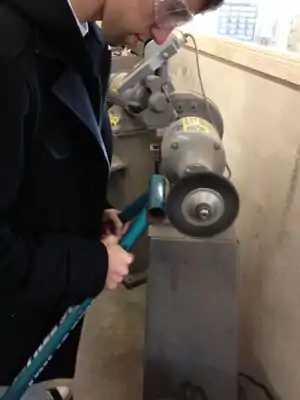 Front support hacksawing (photo by Alberto Jasso) - Prepare the front supports for welding. Front supports came from the front handle bar support bracket of the scrap bicycle.