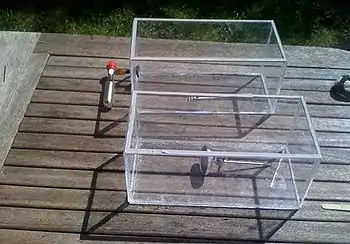 The third part of the final design box is a model greenhouse experiment, the box will include two clear boxes made of plexi-glass and glued by silicon about the size of a shoe box. Using a CO2 cartridge and a release valve, CO2 is injected into one of the boxes. The other box will be left alone and there will be thermometers inside each of the boxes to record the temperature increase. There will be heat lamps included which will be turned on pretending to be the sun and they will warm up the boxes, but because the first box has CO2 inside of it, it will rise in temperature at a much higher rate. The point of this experiment is to show that in a world with much more CO2 there is a much higher temperature amount than the one without or less of it. The students will use this experiment to record the temperature every 30 seconds or minutes for data and at the end of a certain time (10 minutes) they will use the data gathered and create a graph of time vs. temperature for each box and they will see a steady rise in temperature in the CO2 filled model greenhouse. A picture of the actual model can be seen in Figure 1.