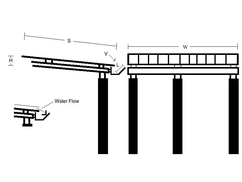 Where FWind is the force acting on the gutter due to the wind, ρ is the density of air, V is max wind speed, L is the exposed gutter edge length and W is the width of the roof.