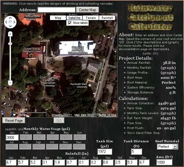 The Rainwater Collection Calculator found at http://www.pequals.com/rain/ was created to assist in building a rainwater catchment system. Instructions on how to use the tool as well as the basis for calculations are presented here.