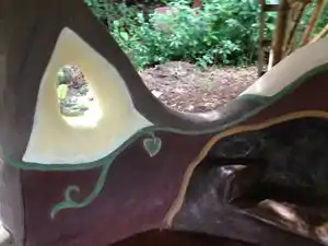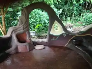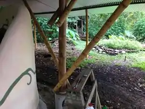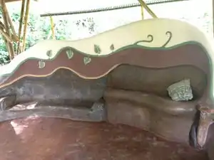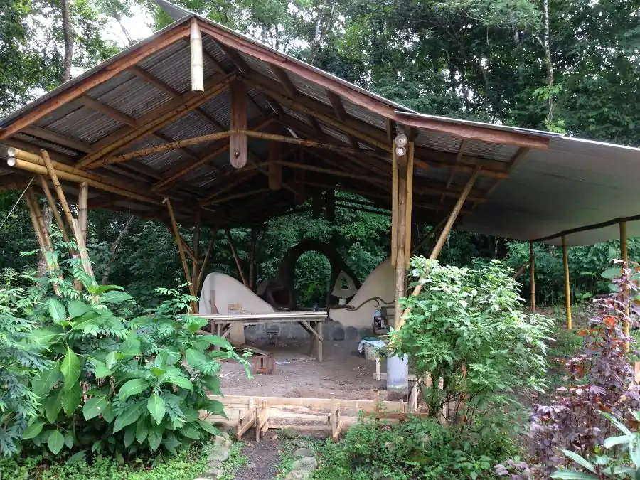 The Ceiba lounge at Rancho Mastatal was built using various natural building techniques, including cob, wattle and daub, earthen plaster, chorizo, taquezal, clay paint, earth bag, and a nylon web technique. It serves as an example for many of the natural building techniques used around the farm. It is also a space slightly away from the bustle of the main house where one may relax. The roofed area around the lounge will be made into a processing kitchen for making things like cheese, soda balm, stocks, soap, and homemade beer known as "hooch".