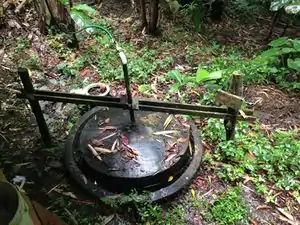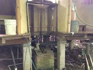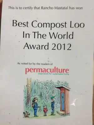 Rancho Mastatal in Costa Rica has an award winning floating drum biodigester toilet. Jose Luis Zuñiga of Rancho Montezumo, a coffee producing ranch near Puriscal, Costa Rica, helped Rancho Mastatal with the design and construction of the biodigester. The biodigester processes human fecal waste in an anaerobic environment, and its byproducts are compost and methane. The compost deposits into the forest below the biodigester, and the methane is fed to the main house kitchen where it is used to cook food.
