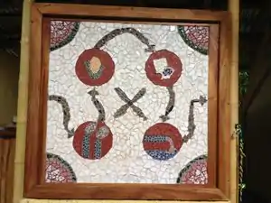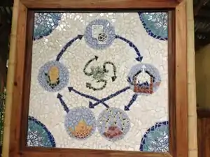 This closed loop artwork created by Maudie Johnson displays a representation of the biodigester toilet system. Explanation from left clockwise: Food is eaten and turned into poop. Poop is flushed into the biodigester, where it is processed into compost and fuel. The compost grows more food, and the fuel cooks the food before it is eaten, continuing the cycle. |