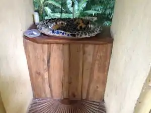 The hand washing sink is a good example of how broken tiles can be used to make aesthetically pleasing and practical structures. The water from the sink flows into the forest below. |