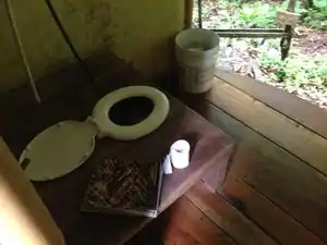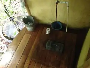 The other toilet is a sitting toilet for "conventional" pooping. It is flushed by turning on the water to a hose that is inserted inside the toilet bowl. |