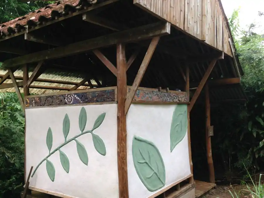 The composting toilets at Rancho Mastatal convert human waste into fertilizer for plants. It has two large compartments to store waste, and it uses sawdust produced either from the onsite workshop, or from another local sawdust resource. The frame of the structure was created using bamboo and timber connected with a mortise and tenon technique.