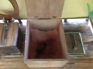 This image shows the gate to the left waste compartment. When it is full the toilet is moved to the right compartment, and the material in the left compartment is given time to fully compost. As the right compartment fills up, the left one has time to become compost and be used for gardening. When the right compartment fills up the toilet is switched back to the left compartment and the cycle repeats. |