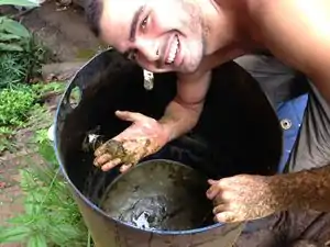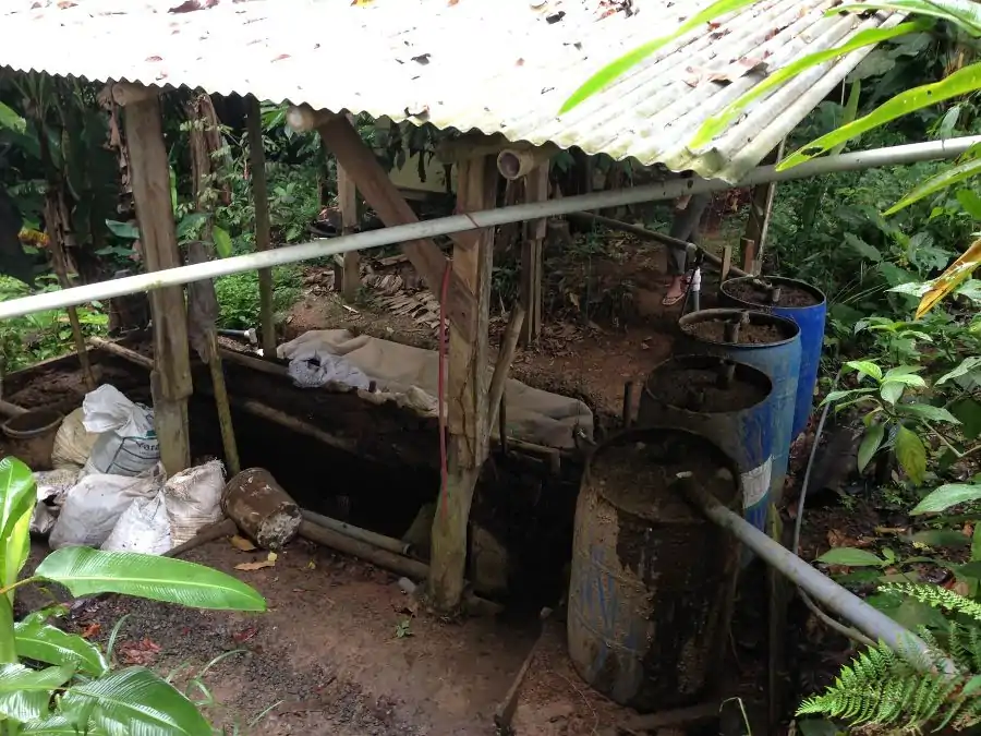 The manure biodigester at Rancho Mastatal converts animal waste into fertilizer and cooking fuel. It also provides extra waste material to the nearby floating drum biodigester toilets if the biodigester toilet use is not frequent enough to keep the drum functioning.