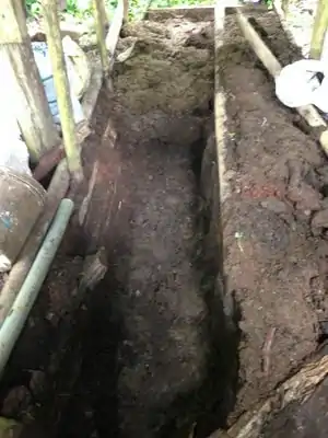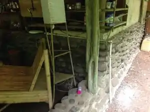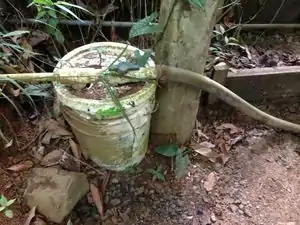 Methane is collected from the anaerobic digestion and piped to the kitchen. This is a bucket between the biodigester and the kitchen used to catch liquid particles that make it through the pipe. |