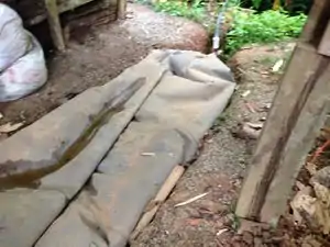 This image shows the settling tanks. The settling tanks let the solids rise to the top. The solids are collected and placed into a composting basin, while the liquids drain to the biodigester bag. If more material is needed in the nearby floating drum biodigester tank, then the liquids are diverted to that tank. |