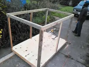 Caption - Assemble the wall frame. • Attach the 4’ long 2”x2” members to the floor frame as shown in the figure. Once the frame piece has been attached it should be held in place until the upper portion of the frame has been completely attached to all the wall framing.