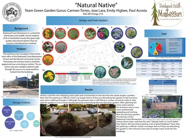 Redwood Coast Montessori and the Manila Community Center allowed Humboldt State University's Fall 2014 ENGR215 Introduction to Design class to implement several student-designed projects that benefited the community. The Wayfinding Entrance Garden project's main objective was to create an attractive, inviting entrance for the school that included native plants. The inclusion of edible plants was also a consideration in the design. The garden was envisioned as a place where students might be able to learn about the care of a native garden while enjoying the sights, smells and tastes of the plants.
