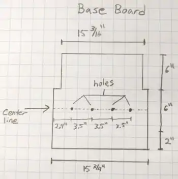 The finish line placement mechanism is constructed from wood, with a sturdy metal housing used for the gate portion. Begin by measuring the width of the metal box to be used as the gate housing. Cut a piece of ½” plywood that spans the width of the metal box to be used as a base, and extends 6” out of the back, and 2” out of the front. Draw a line across this board directly in the center of 6” metal housing, which is 9” from the back and 5” from the front. Drill 4 holes on the center line, starting at 2.4” from the side, then space each hole 3.5” from the previous hole, see Figure 5-12.
