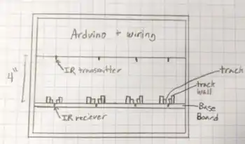 Construct a box to hold the Arduino, wiring, and LEDs which will be mounted above the base board. The box is to be positioned so that the infrared receiver and infrared transmitter are located within 4 inches of each other. Drill out 4 holes to mount the infrared transmitters located above the holes for the infrared receivers. Drill out 4 additional holes on the front face place of the box for the indicator LED’s. Cut 8 14” long, ½” wide strips of ½” plywood to be used as track, cut 8 14” long, ¾” wide strips of ½” plywood to be used as track wall. See image Figure 5-13. Glue the track strips so that there is a ½” gap in between, with the hole for the infrared receiver positioned in the center of the ½” gap. Glue the track wall strips on the outside of each track strip to form the dual use track.