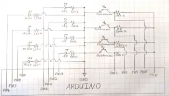 Wire up all the electrical components for the circuit based on the provided schematic seen in Figure 5-14. I highly recommend creating a test circuit first using a solderless bread board before creating the final circuit. Begin final circuit by soldering 330Ω resistors to the anode of each indicator LED, the anode is the short leg on the indicator LED, then solder ground wire to the other side of the resistor, and color-coded wire to each cathode. The ground wire will lead to the main ground on the Arduino and each cathode wire will lead to PIN10,11,12,13 on the Arduino. Next solder 220Ω resistors to the cathode of each IR LED, the cathode is the long leg on the IR LED, with ground wire soldered to the other side of the resistors. Solder color-coded wire to each cathode of the IR LED and run them to PIN6,7,8,9 on the Arduino. Solder four 330kΩ resistor to the positive lead wire from the 5v port on the Arduino unit, then solder the other side of each 330kΩ resistor to both the wire connected to the cathode of each IR Phototransistor and to each wire that connects to PIN2,3,4,5 on the Arduino. The cathode is the long leg on the IR Photo-transmitters. Make sure to implement a quick disconnect on the wires that travel between the lower base plate (for the IR Phototransistors) to the upper box that houses the Arduino in order to be able to separate the two halves for maintenance, also leave extra slack on these wires to make for easy connection/disconnection. Label each side of the quick disconnects in order to ensure proper reconnection. Power the Arduino with a AC to DC transformer rated between 7.5-12V 600mah-1000mah DC.