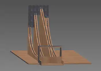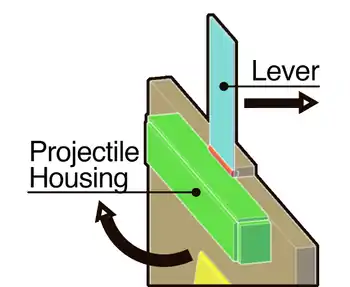 Starting mechanism can be constructed with a door hinge and some plywood. A hinge links the rotating door/projectile housing to the body of the Brachistochrone. The lever should be at least a foot in length in order to give an enough torque for an easy open. Since each path starts at a different angle the projectile housing must be measured for each individual track. If the measurements are calculated and pieces of wood cut to dimensions then they can be put together with a drill and screws easily.