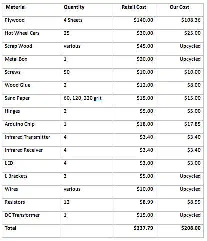 The Arduino chip components of the finish line are rated to last many years of constant use, if however they do require replacement the price will range depending on the component. The Arduino UNO Microcontroller can be found for $12, the LED and Photoresistors tend to be $0.25 each. Repainting the design will all depend on how much damage the exterior takes from the kids playing with the design. If the damage is minor then painting over will only take a few minutes, costing around $5. To repaint the whole design will take longer. The hinge that is attached to the starting mechanism may have to be replaced depending on the amount of use it gets. Kids could pull the handle to hard and over time may become loose and need replacing. This is a simple replacement, and will only take about 5 minutes with a drill and cost around $5.00. Cleaning may need to be done depending on how much debris gets on the tracks, making it difficult for the vehicles to go down the track. A quick sweep or dusting will suffice and only take about 5 minutes. Hot wheel cars will need to be replaced as they are lost, stolen, or broken. These can easily be ordered online for nearly a dollar per car. Golf balls depending on what kind you buy can vary in price, but the cheapest can be found online for about $0.50 each.