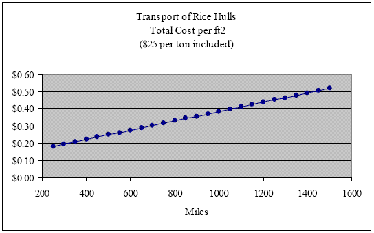 Supposing that we pay not $5.00 but $25 per ton (well above current market value), we find that the purchase price of the rice hulls per ft2 wall insulated is only $0.11. Adding this $0.11 back into the cost of transport over these same distances, we arrive at a total cost per ft2 of the rice hull delivered to the job site of $0.18, $0.25, $0.32, $0.38, $0.45 and $0.52 respectively (see graph below).