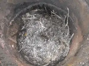 If using different crops or crop parts, layer them. Put a large stick in the middle to assist with air flow. - Place drum on 3 rocks so air flows through the bottom, light from the bottom.