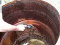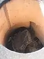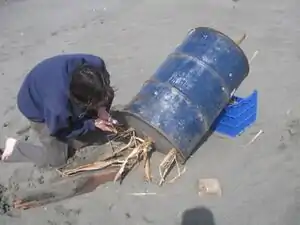 Cover with lid, and remove rocks from the bottom while supporting the drum with the large stick. Seal the bottom with sand or dirt. - Wait at least two hours.
