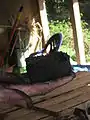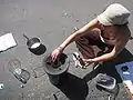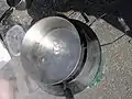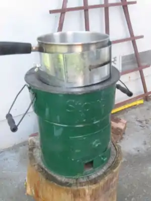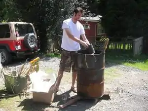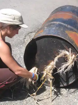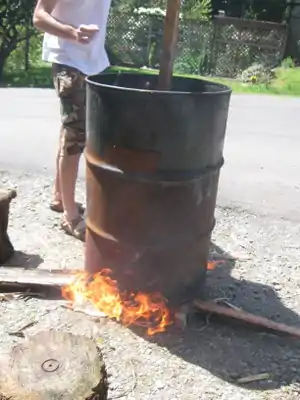 Kiln/vessel with lid for carbonizing, we used a 55 gallon drum (being cleaned in this image)