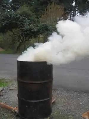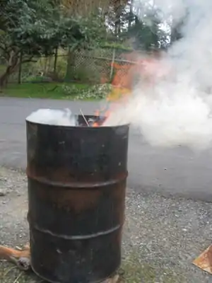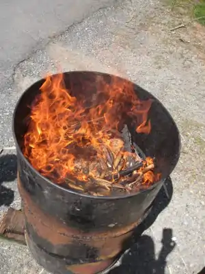 Place drum on 3 rocks so air flows through the bottom, light from the bottom. - Let burn for 5-10 minutes until smoke clears or changes color.