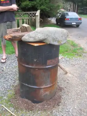 Let burn for 5-10 minutes until smoke clears or changes color. - Cover with lid, and remove rocks from the bottom while supporting the drum with the large stick. Seal the bottom with sand or dirt.