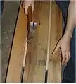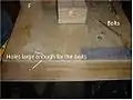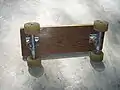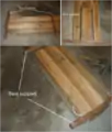 The seat was constructed using two pieces of wood and a set of skateboard trucks and longboard wheels. In this case, two pieces of wood were used to increase the strenth of the seat. To assemble the seat, first place the longboard wheels on the skateboard trucks and secure them using nuts. Next, turn the piece of wood so that it is top-side down and align the skateboard trucks on the bottom. The trucks must be parallel and centered to the width of the wood, one inch from the ends of the lenth and as in line with one another as possible. Once properly placed, take a pencil and outline the trucks and mark where the holes will be. These holes must then drilled and the trucks can be screwed in. While the orientation of trucks is important when actually being used on skateboards, it almost irrelevant when making this seat.
