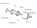 The following operation for constructing your own friction drive blender interface is not a universal solution. As explain in the literature review, the various styles of blender couplings will determine the approach to take. This solution is one way to do it but will likely not come out exactly the way shown. A discarded, multiple speed freewheel, rear bicycle hub is used as the central component. A skateboard wheel is used as the friction roller. The blender coupling attached to the base of the blender is threaded off the drive shaft. This coupling is threaded on in reverse and is unthreaded in reverse. The coupling and the skateboard wheel are attached to the axle of the hub using a quick release skewer and a series of nuts and spacers. The diagram below in Figure 5-19 shows the order in which the described items are put together to create the blender drive interface. Figure 5-19 shows the components that need to be stacked on the skewer in order. First, the coupling needs to be drilled out for the skewer to pass through. Use a drill bit that is as close to the outer diameter of the skewer as possible. On the top side of the coupling, drill a larger shallow hole for a lock nut to sit flush in. This should look like the result shown in Figure 5-20. Depending on the skewer that is available, an unspecified amount of washers will need to be included in the stack of components on the skewer. It is important that the skewer does not protrude beyond the top of the lock nut as seen in Figure 5-20. Use enough spacers to achieve this. The end result of the friction drive blender interface should look like something similar to Figure 5-21.