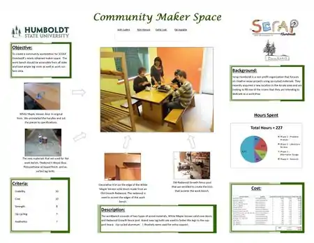 SCRAP Humboldt, a division of SCRAP, is a non-profit organization that works with the community to reuse waste material in ways that are creative and environmentally sustainable. They are currently opening a new workshop "Maker-Space" in the Arcata area that will be used to produce up-cycled art projects for the community. These projects will range from small to very large in physical size, and having a proper place to work on them is critical. The Community Tinker Desk is a perfect solution to this dilemma.