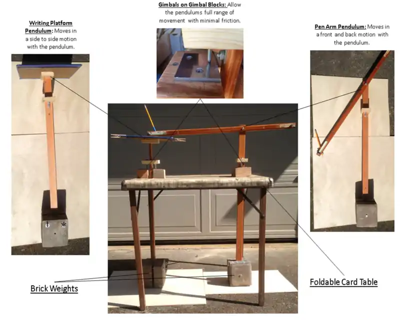 Based on our criteria, a two pendulum harmonograph was the ideal solution. A harmonograph is a machine that uses pendulums to create parabolic curves, or Lissajous figures. The harmonograph has two pendulums that swing perpendicularly with a pen and paper attached. As pendulums swing, they swing at fixed frequencies. The pen and paper track the combination of the two frequencies and create a drawing. The drawings show the harmony between the two pendulums. Below is a diagram of the final solution with labeled parts.