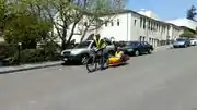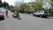 We thought it would be a good idea to test our weight constraint as soon as we finished the project. Below are two pictures of the trailer (and Michael) being towed up and down a hill, and two pictures of the trailer displaying a visibility test during the night. The brake test was a success and the trailer itself didn't need brakes to bring the bicycle to a complete stop. It was also possible to tow the trailer with the 155 pound payload up hill. It may not be a pleasant or simple task to complete, but it is possible. The visibility test pictures speak for themselves. The unique element of the reflectivity that the road sign provides makes the trailer exceptionally visable.