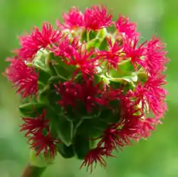Salad burnet has leaves that are very fine, delicate, loose, and fern-like. The flowers are small and pink, purple-pink to reddish, with a roundish appearance.