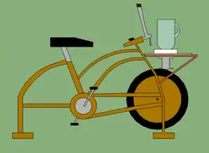 The Mechanical Munchy-Maker is constructed from a 1982 Schwinn Exercise Bike. The blender is attached to a base and connected to a friction drive. The friction drive is positioned on the top of the bicycle's flywheel and allows the blender to sit in front of the operator for ease of control as he or she is pedaling.