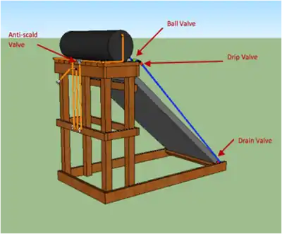 The solution includes a thermosyphon heating system with a redwood enclosure and claw foot bathtub, fitting the hostel’s rustic theme, as shown in Figure 1. Attached to the redwood enclosure is a handrail for the guests’ safety, and a small shelf. The platform is constructed of redwood, upon which the water tank will be placed. The solar collector is mounted on the structure at a 40 degree angle, allowing for maximum solar exposure. The plumbing consists of three ball valves and two drain valves, labeled in Figures 1 and 2, that can be used to isolate and drain the system. The anti-scald valve is used to set a maximum water temperature in order to prevent user injury. The drip valve prevents pipe cracking by releasing the system pressure as water in the system cools and expands. Water circulates through the system continuously through the process of natural convection. Cold water enters the system through the blue coldwater inlet seen in Figure 2.[1] Inside the tank cold water flows down the blue pipe seen in Figure 3 and enters the solar collector. Water inside the solar collector is heated by the sun and naturally flows to the top of the solar collector and back into the tank through the red pipe shown in Figure 2.[2] Hot water is piped from the top of the water tank, through the user temperature control, and finally provides a warm shower for the user.