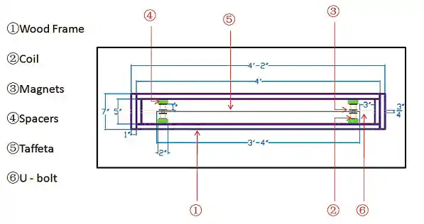The major components of one of our Windbelts™ from our MultiBelt Windbelt™ are shown. This includes the frame, tensioners, coils, magnets, and the belt.