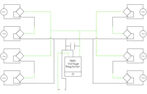 The wiring diagram above shows the systems electronics from the coils (~), through the rectifiers (diamonds) to the voltage regulator.