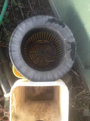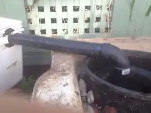 Caption - CONNECTING PIPE & PLANTER BUCKET IN TUB 1: The pipe from the second grease traps connect to an ABS elbow pipe that allows the pipe to go towards the bottom of the tub. This pipe resides 5" deep inside the planter bucket. Right underneath the output of the pipe is a screen 5" in depth so that they fit snug in the planter bucket. The planter bucket contains a series of small holes on the sides so water can seep out.