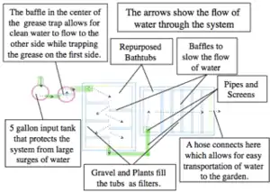 Grease Trap : For this grease trap our team used repurposed plastic buckets that are placed side by side and connected by a 5" long pipe at the bottom. These buckets are side by side because the "wall" in between the buckets acts as a trap for grease. Water is coming from the sink, meaning there is a large amount of grease in the water. In the first bucket, where water enters from the house, a screen 5" in depth lies on the top of the bucket. Inside this screen are a few layers of straw and other grease absorbing plants/material. The point of this first bucket is to trap the grease on the top of the water where the plants/material can absorb the grease. Less greasy water then travels through the 5" long pipe into the second bucket. Once enough grey water fills the second bucket it will flow into the first tub for further filtration.