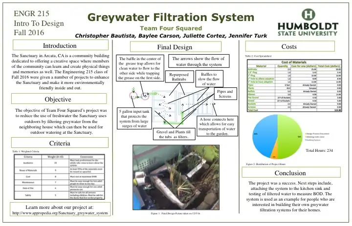 Team Four Squared is a group of Humboldt State University students who are a part of the Engineering 215 - Introduction to Design class of Fall 2016. Our client, The Sanctuary, located on J street in Arcata, CA is a community building dedicated to offering a creative space where members of the community can grow, create and build not just physical things but experiences and memories as well. This greywater system will serve not only as a water filtration station but also as inspiration for others to build their own greywater filtration systems.